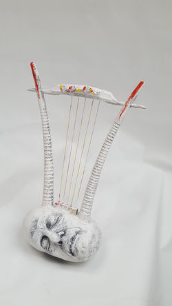 Haas has invented multiple instruments for the installation, including a lyre made from his sculpted head, a trumpet skull, a serpent-shaped horn featuring a dragon's head, and a hybrid-string upright incorporating a radio.